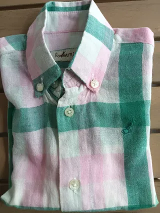Conjunto de dos camisas de manga larga para niño. Camisa a rayas blancas y rosas con cuello blanco.3A Camisa de cuadros rosas y verdes.3A Ambas de la firma la hormiga