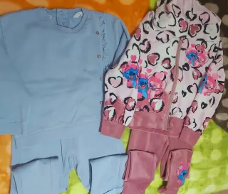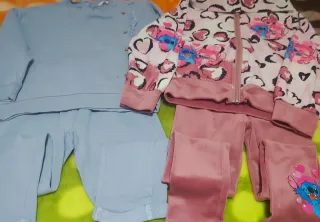 Conjunto de dos chándales para niños de 3 a 4 años. Uno de la marca Mayoral y otro con diseño de Disney. - Chándal de Mayoral en color azul claro. - Chándal de Disney con estampado de Stitch y corazones en rosa y blanco.