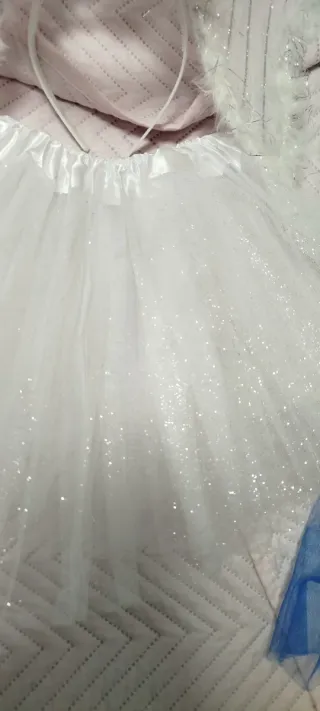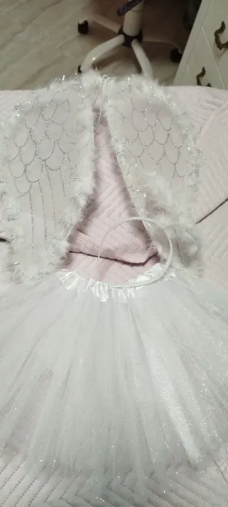 Conjunto de disfraz de ángel blanco, perfecto para fiestas o eventos. - Alas de ángel con plumas y detalles brillantes. - Tutú blanco con tul y purpurina. - Aro para la cabeza a juego.