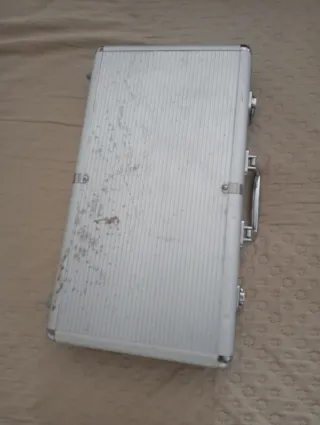Maletín plateado con acabado metálico, ideal para guardar y transportar tus juegos de póker. - Diseño robusto y elegante. - Cierre de seguridad.