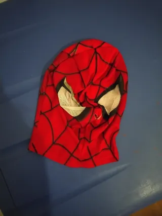 Disfraz de Spiderman para niño, ideal para fiestas o juegos. Se ha usado dos días. Es oficial. El pecho está acolchado con espuma. No tiene la talla porque le picaba la etiqueta y se la he cortado. - Diseño inspirado en el personaje. - Tejido rojo con telarañas negras. - Máscara con detalles de ojos blancos.