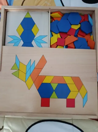 Rompecabezas de tangram de madera con diseño de animal. - Piezas de colores: azul, verde, amarillo, naranja y rojo. - Base de madera clara.