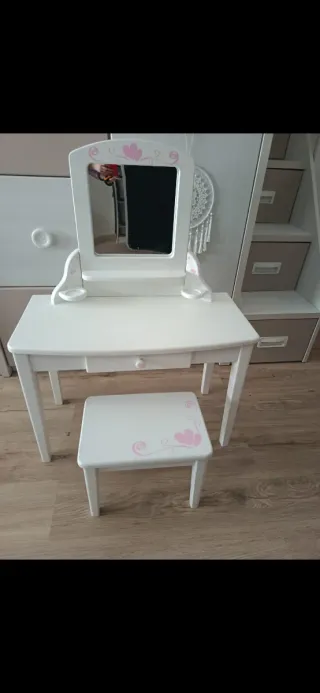 Tocador infantil blanco con espejo y taburete