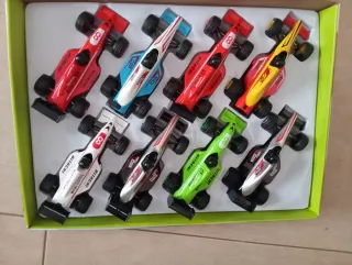 Conjunto de coches de carreras de juguete. - Diseño tipo Fórmula 1. - Colores variados: rojo, azul, amarillo y verde. - Detalles de patrocinadores y número 8 en algunos modelos.