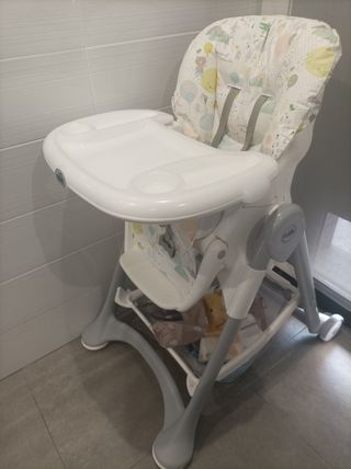 Trona de bebé en muy buen estado. Cuenta con una cesta abajo grande para dejar cosas, se pliega muy bien para guardarla y también tiene una bandeja más grande que se puede quitar y poner.