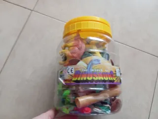 Bote con varios juguetes de dinosaurios. - Incluye figuras de diferentes dinosaurios. - Tapa amarilla. - Etiqueta The World of Dinosaurs.