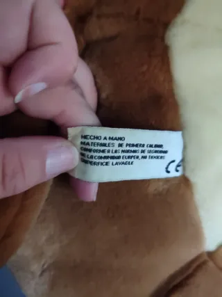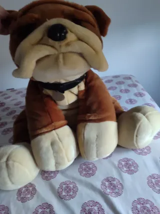 Adorable peluche de perro estilo bulldog, de color marrón y crema. Es suave y perfecto para abrazar. - Diseño de bulldog con arrugas características. - Collar negro con placa. - Patas grandes y blandas.