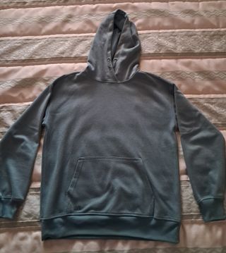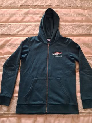 Sudadera verde con capucha y bolsillos frontales. También lleva un bolsillo con cremallera en la manga. De la marca Boomerang. Talla 13-14 años. En muy buen estado.
