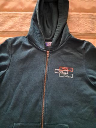 Sudadera verde de Jack & Jones, talla 13-14 años. Con cremallera, capucha y bolsillos frontales. Muy bonita. En muy buen estado porque se ha usado muy poco.