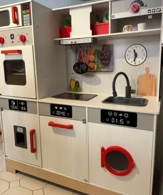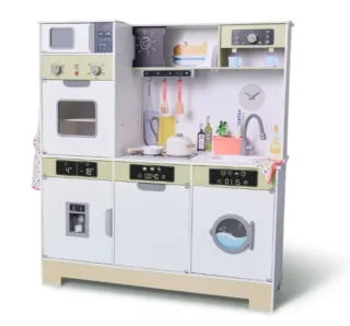 Divertida cocina de madera para niños (Lidl), con un diseño moderno y completo. Poco uso. Está montada. - Incluye microondas, horno, lavadora y frigorífico (hecha hielo) - Zona de cocina con fregadero y grifo. - Estantes para accesorios. - Luz y sonido