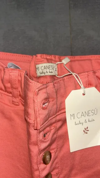 Pantalones de la marca Mi Canesu Están sin estrenar Veinte euros cada uno - Diseño con botones. - Etiqueta de la marca visible.