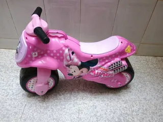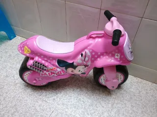Moto de juguete rosa con diseño de Minnie Mouse. Ideal para los más pequeños. - Ruedas anchas para mayor estabilidad. - Manillar con puños negros. - Decoración con lunares blancos y dibujos de Minnie.