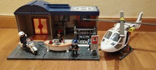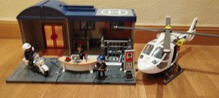 Comisaría Playmobil en perfecto estado, lista para nuevas aventuras. Incluye dos figuras de policías, una moto y un helicóptero. -Comisaría con detalles realistas. -Helicóptero con rotor funcional. -Figuras de policías con accesorios. -Moto de policía detallada.