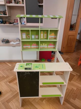 De madera, con cajón para dinero, pizarra y estantes para colocar el género. En perfecto estado.