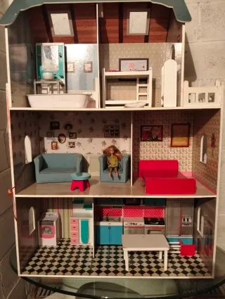 Casa de muñecas Amanda de madera, con varios niveles y habitaciones. - Diseño de casa de dos plantas con ático. - Incluye mobiliario detallado para cada estancia. - Habitaciones decoradas con papel pintado y accesorios. -Con luces y sonido. -Incluye la familia de 4 en muñecos. Nueva me costó alrededor de 230euros
