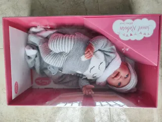 Muñeca de la marca Antonio Juan con cuerpo de tela. - Presentada en su caja original - Mecanismo de llanto activado por sonido. - Incluye accesorios: gorro, pijama, chupete con cinta y mantita. - Tamaño: 37 cm.