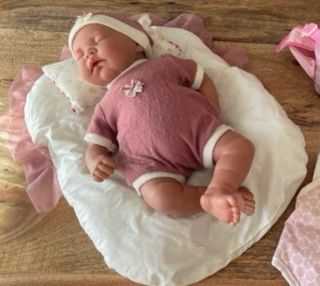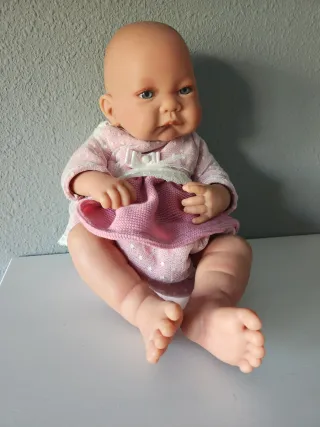 Preciosa muñeca de Antonio Juan en perfecto estado . Es muy linda y parece un bebé real , tiene el cuerpo de tela para poder abrazarla como un bebé y puede moverse , sentarse , etc . Mide unos 46 centímetros. Está esperando a su nueva mamá .