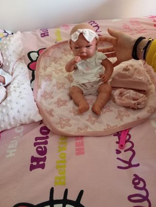 Muñeca Reborn de la marca Antonio Juan. Tiene un cuerpo blando y detalles muy realistas.Cuerpo de tela suave.Ojos gris/azules, y con pestañas. Viene con ropa,gorro, almohada original y una almohada y manta extra.Tiene sonido al apretar la tripa.Se puede mover la cabeza.Mide unos 49 cm y pesa casi unos 4 kilos.Precio negociable(Precio del producto original 72€)