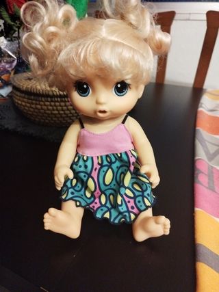 Muñeca Baby Alive con vestido rosa. - Vestido rosa con lunares blancos. - Adorno floral en el pecho. - Volantes en el bajo del vestido. Habla, come y hace pipi tiene una pierna un poco fuera pero puede sentarse ver fotos