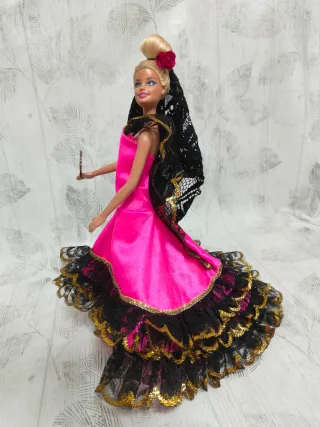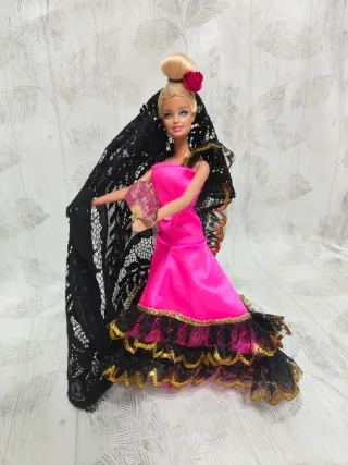 Muñeca Barbie vestida de flamenca con mantilla. - Vestido rosa brillante con volantes negros y dorados. - Mantilla negra de encaje. - Lleva un abanico. - Flor roja en el pelo.