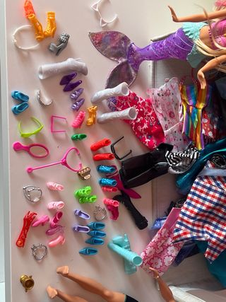 Accesorios variados para muñecas Bratz y Barbie. Desde 0,50€: - Chaqueta azul... 1,50€ - Vestido camarera Barbie... 2,50€ - Pantalones negros... 2€ - Gafas unidad... 1€ - Top malva y fular... 1€ - Bolso plateado... 0,50€ - Botines negros Barbie... 2€ par - Botas rosas o blancas... 2€ par - Jersey blanco Barbie... 2,50€ - Falda vaquera tablas... 2,50€ - 2 tops... 3€ - Chaqueta roja (lo ha dado todo) 1€ - Falda roja... 1,50€ - Pantalones vaqueros... 1,50€ - Bolso negro con cadena... 2€ unidad - 2 pares de botines blancos y marrones (marrones recortados arriba)... 2,50€ - Lote completo 24€