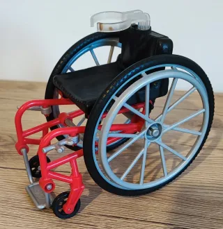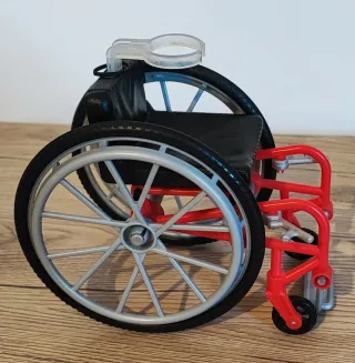 Silla de ruedas para Barbie. Es completamente nueva. - Estructura principal en color rojo vibrante. - Ruedas grandes plateadas con detalles negros. - Asiento y respaldo en color negro.