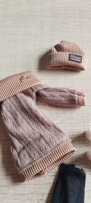 Conjunto de ropa para muñeca Barbie. - Jersey de punto color marrón pálido con cuello Bardot. - medias negro. - Par de zapatos blancos. - Gorro de punto con etiqueta Hand made.