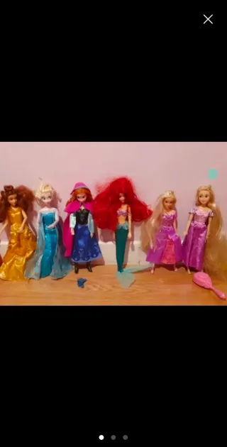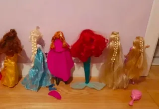Lote de 5 muñecas de princesas Disney. - Incluye varias princesas populares. - Ideales para coleccionar o jugar.En buenas condiciones, excepto las melenas que no están como nuevas ( foto 3). Una de las Rapuncel tiene un cepillo q al meter hielo hace q sus mechones más claros cambian al color rosa ( foto 2). Se venden por separado a 5€ cada una. la sirenita ya no esta disponible