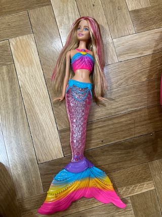 Muñeca Barbie con temática de sirena. - Cuerpo de Barbie con cola de sirena. - Cola de sirena con escamas y aletas. - Colores vibrantes en la cola y el top. Tiene comoartimento para pilas pero está oxidado y quizás no funciona