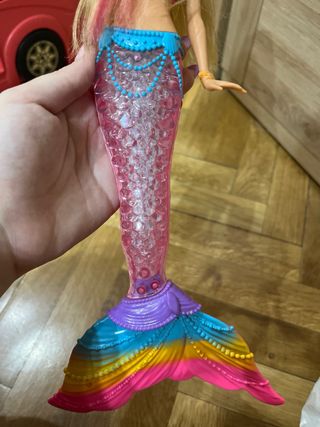 Muñeca Barbie sirena con un diseño colorido y detallado. - Parte superior con escamas y detalles brillantes. - Cola de sirena con degradado de colores vibrantes y al pulsar su collar tiene luces de colores. - Aleta de cola con acabado iridiscente.