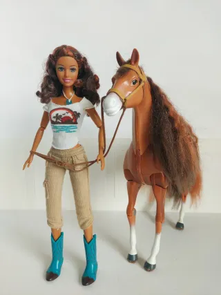 Preciosa muñeca Barbie y su caballo, listos para nuevas aventuras. Incluye dos muñecas y un precioso caballo marrón con silla doble. Incluye cepillo