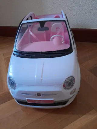 Coche de juguete estilo Fiat 500, ideal para muñecas. - Color blanco con detalles interiores en rosa. - Techo abierto. - Ruedas con llantas rosas.