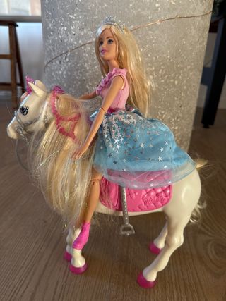 Muñeca Barbie princesa con su caballo unicornio. - La muñeca lleva un vestido brillante con estrellas. - El caballo unicornio tiene detalles luminosos en el cuerno y patas. También tiene sonido. - Incluye corona para la princesa y bridas para el caballo.
