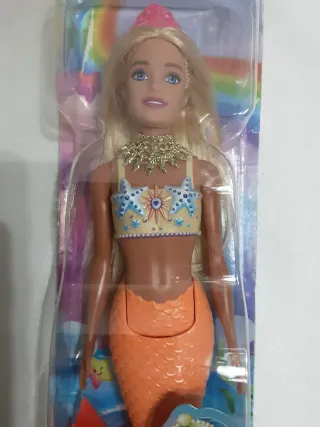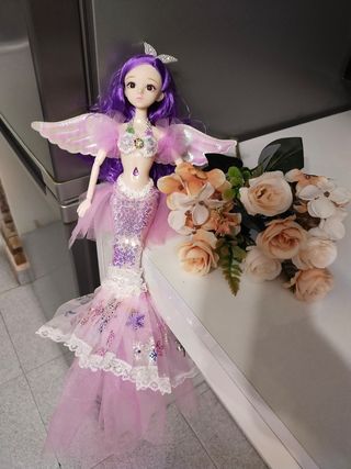 Precio fijo. Muñeca Sirena articulada, muy bonita. Tamaño de Barbie. Con la cola mide 45 cm. La ropa está pegada al cuerpo. Las alas se quitan. Nueva. Envíos Wallapop.