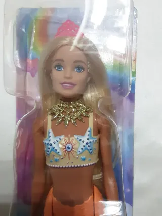 Muñeca Barbie sirena, se le ha cambiado la cabeza original y se ha vuelto a pegar el blister. - Corona rosa. - Collar dorado. - Top con detalles de estrellas y conchas. - Cola de sirena naranja escamada.