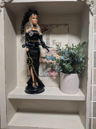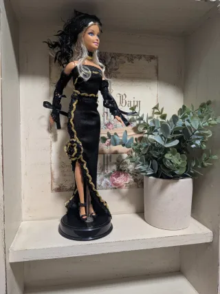 Muñeca Barbie con un elegante vestido negro largo con detalles dorados. - Vestido largo con abertura. - Adornos dorados en el vestido. - Incluye tocado y guantes. - Muñeca de colección.