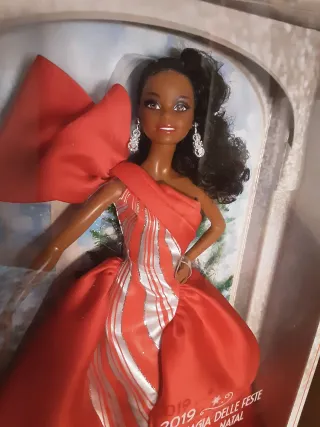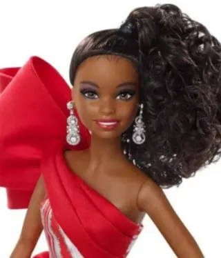 Muñeca Barbie Edición Especial Felices Fiestas. - Diseño festivo con un gran lazo rojo. - Vestido elegante con detalles plateados. - Pendientes brillantes. - Cabello oscuro recogido en una coleta alta.