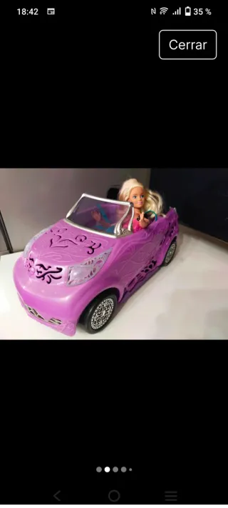 Coche descapotable morado con detalles ornamentales. - Diseño con filigranas. - Ruedas decoradas con motivos. - Muñeca Barbie incluida. - Precio fijo, es lo que me costó, no me ha caído del cielo. La muñeca de regalo. - Envíos Wallapop, mejor con Inpost. 🛑 Nota importante: el peso (mínimo) está elegido para Inpost. Para correos habrá que poner más, porque con buen envoltorio pesará bastante.
