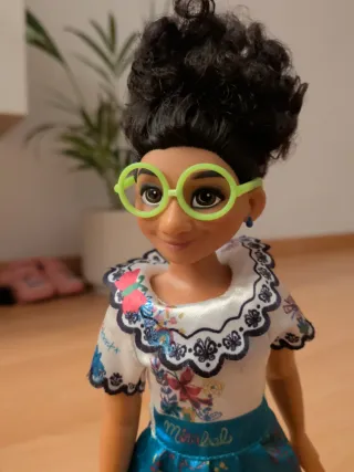 Muñeca de Mirabel, personaje de la película Encanto de Disney. - Vestido azul con detalles. - Gafas verdes. - Pelo rizado y recogido. (Regalo muñeca tipo Barbie en condiciones aceptables).