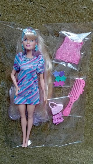 Barbie Totally Hair con pelo extra largo. Viene completa, con pendientes, bolso, zapatos, peine, chaleco y lote de estrellas con velcro que se adhieren al pelo (cambian de color con el calor). Como NUEVA. Tengo más muñecas en mi perfil.
