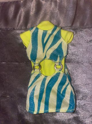 Precioso vestido para muñeca Barbie. Es de color neón y tiene un estampado de cebra en tonos turquesa y blanco. Tiene un diseño único con aberturas laterales y detalles metálicos. ¡Ideal para darle un toque moderno a tu colección! - Vestido con estampado de cebra. - Colores neón y turquesa. - Detalles metálicos.