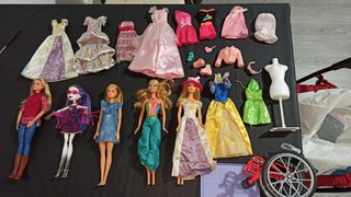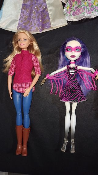 Lote de 4 barbie y una Monster High Polterghoul. Contiene también todos los accesorios y ropa que se ven en las fotos. Algunos vestidos están manchados. Las muñecas están lavadas y peinadas, excepto la barbie hada. Se puede vender por separado. Si te interesa algo en particular, pregúntame por privado :)