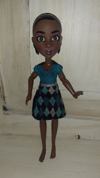 es un poco más pequeña que barbie.articulada,desconozco marca..va con otro vestidito aparte que regalo