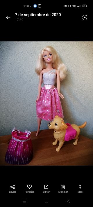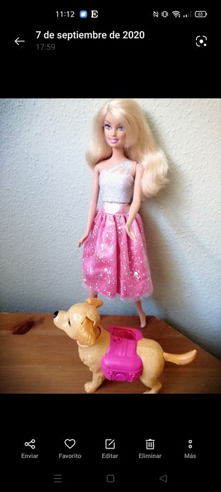 Muñeca Barbie pasea a su perro. Además del perrito, incluye un vestido de fiesta corto, para que Barbie siempre luzca impecable paseando a su mascota. Al perro se le mueve la cabeza y las orejas y porta una mochila rosa que se le puede quitar. Sin caja.