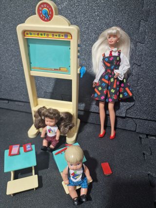 Conjunto de Barbie maestra con dos alumnos y pizarra. Ideal para juego simbólico. Incluye una muñeca Barbie vestida de profesora, dos muñecas más pequeñas que representan a los alumnos, y una pizarra con accesorios. Las muñecas están en buen estado y la pizarra luce impecable.