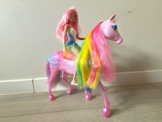 Muñeca Barbie montada en un unicornio mágico con crin y cola de arcoíris. - Unicornio de color rosa con cuerno y ojos azules. - Crin y cola del unicornio en tonos rosa, amarillo, verde y azul. - Barbie con vestido de colores y corona.