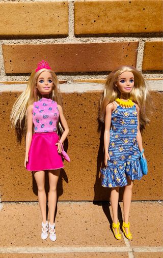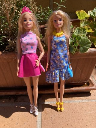 10€ cada muñeca. 18€ si llevas las dos. Dos muñecas Barbie listas para un día soleado. Vienen con accesorios. - Una muñeca lleva un vestido rosa con estampado de diamantes y una diadema. - La otra muñeca luce un vestido azul con estampado de margaritas y un collar amarillo. - Ambas incluyen bolsos a juego.