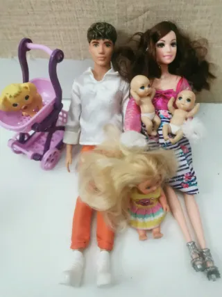 Set de muñecos familiares con accesorios.Ellos son marca Ken ellas sin marca - Incluye dos muñecas embarazadas con bebés. - Dos muñecos varones. - Ropa y bolso para muñecas. - Cochecito de bebé.