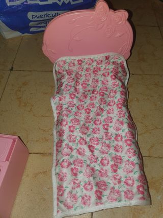 Cama de juguete para muñecas Barbie, con un diseño encantador. De los años 70 antigüedades - Color rosa. - Diseño de flores en la tela. - Cabecero con detalles. - Ideal para colecciones de Barbie.
