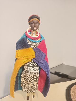 Preciosa muñeca Barbie con un atuendo tradicional africano. Es una pieza única y llamativa. - Vestido con detalles étnicos. - Incluye collar y tocado. - Manta colorida de tela suave.